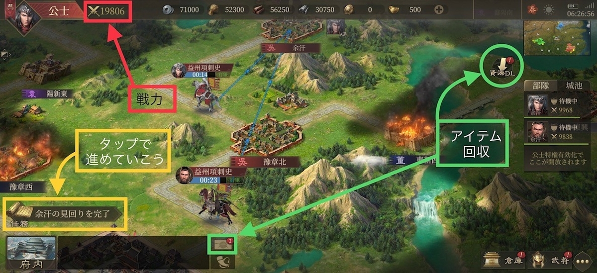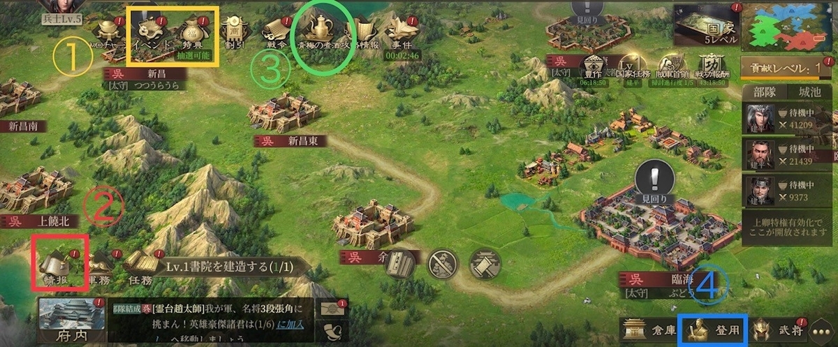 序盤はこの8つが主な日課です。日課で獲得した資源・アイテムを使って、武将の強化・爵位・軍位を上げて戦力を強化していきましょう。