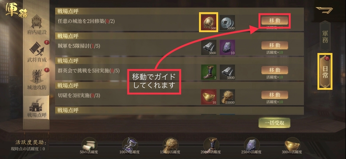 軍務の下に日常(デイリー)もあります。資源が貰えますので、こちらも毎日できるだけやっておいたほうが達成日時が早まります。移動でガイドしてくれるので、政積がもらえるものは優先して達成しておきましょう。