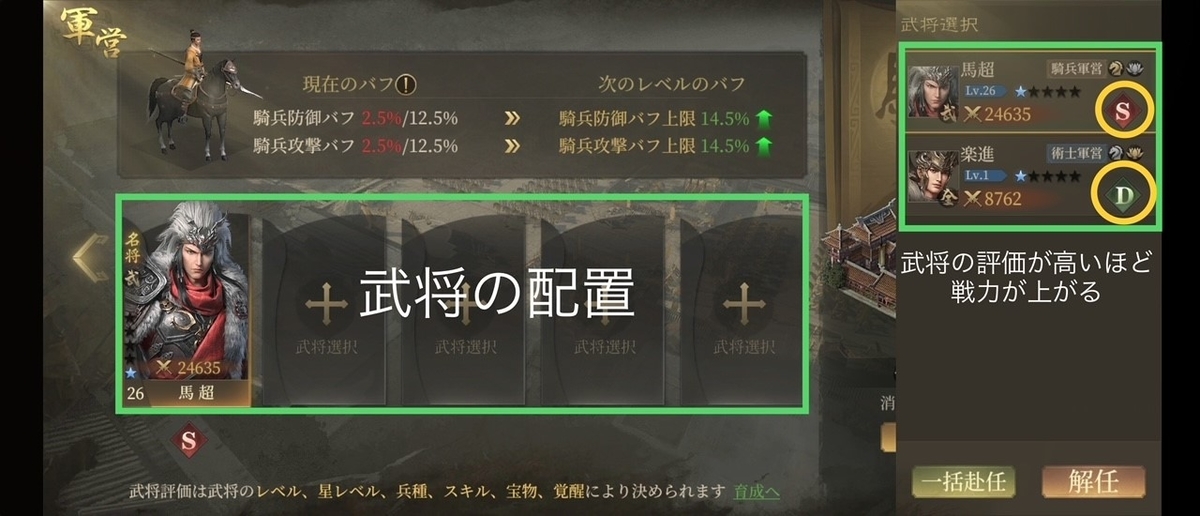 武将を配置することで戦力が上がるので、現状で一番強い武将を配置しましょう。
