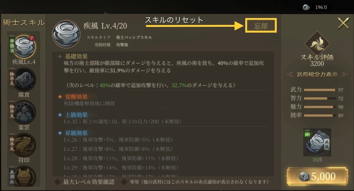 武将獲得から12日間は忘却で素材が100%戻ってきます。その為、スキルはどんどん強化していきましょう。それ以降でも80%は戻ってきますよ。