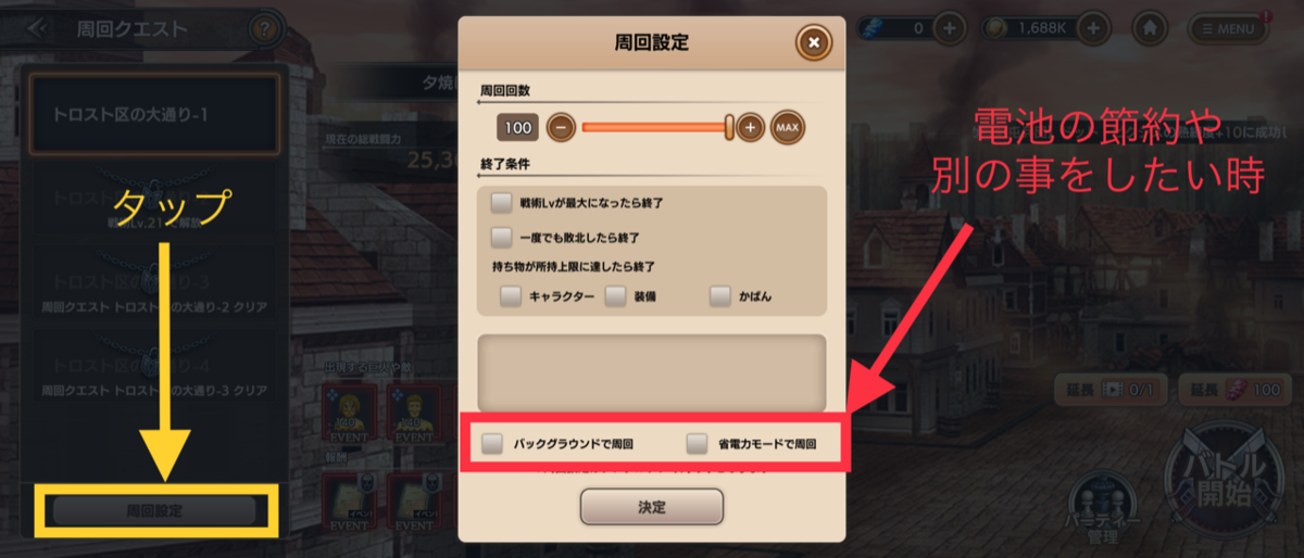 周回クエストは自動でクエストの周回をしてくれます。プレイヤー・戦術レベルが上がると戦力が上がりますので、操作しないときは周回クエストをやっておきましょう。