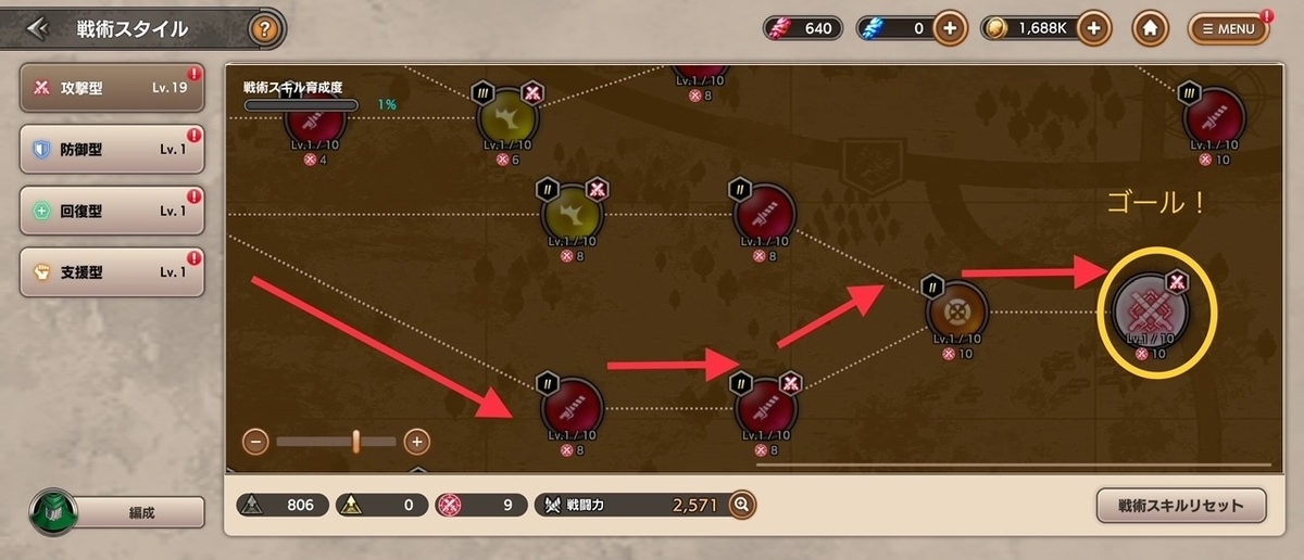 まずは、上のルートの攻撃力を開放していきます。赤い攻撃マークを開放していきましょう。