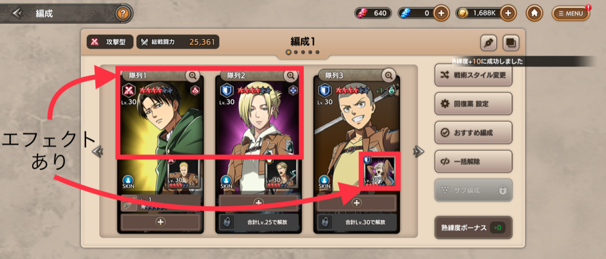 最初の段階ならおすすめ編成で選ばれますが、後から引いた場合は手動で差し替えて強化していきましょう。