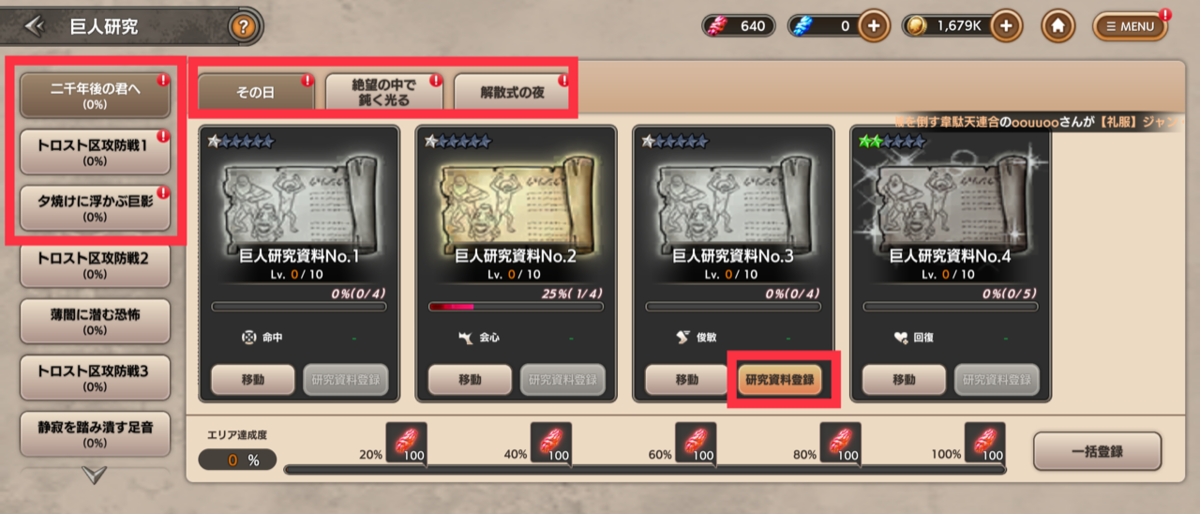 エクストラの壁外調査は戦術スタイルの強化素材が手に入るので、進めていきましょう。クリア時に素材が入手できます。